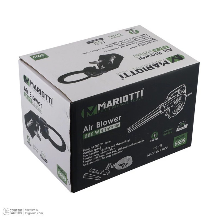 دمنده مکنده ماریوتی با توان 680 وات، یکی از بهترین دمنده مکنده های موجود در بازار است. این مدل با داشتن دامنه سرعت قابل تنظیم از صفر تا 16000 دور در دقیقه، توانایی تولید حجم بالایی از هوا را دارد. حجم تولید هوای 4.1 متر مکعب در دقیقه، توانایی جمع آوری سریع و مؤثر گرد و غبار و آلودگی ها را فراهم می کند. قابلیت تبدیل به جارو برقی با استفاده از سری و لوازم ضمیمه، کاربرد دوگانه و چند منظوره ای را ارائه می دهد. کلید الکترونیک تنظیم دور و دکمه قفل سرعت، بهره برداری آسان و کنترل دقیق را ممکن می سازد.