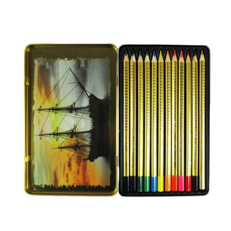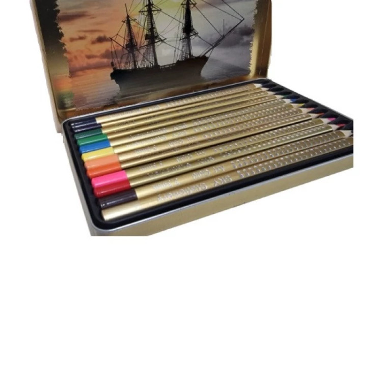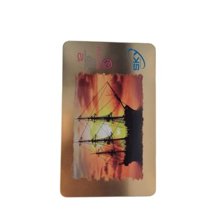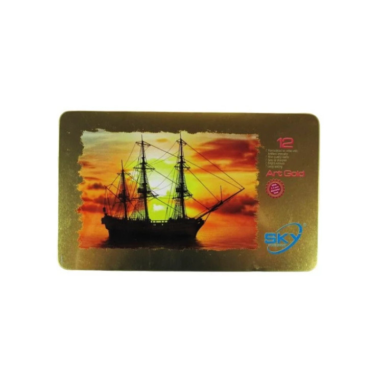 این مدادرنگی علاوه بر داشتن جعبه با بدنه فلزی به رنگ طلایی نیز مدادهای ان هم دارای بدنه طلایی با مغز رنگی است که دارای مغزی مقاوم در برابر آسیب دیدن و شکستن، بدنه ی شش ضلعی و پوشانندگی بالاست و مواد اولیه با کیفیت در ساخت این مداد رنگی ها موجب ایجاد رنگ های درخشان گردیده است. کیفیت بالای ساخت این محصول، موجب سهولت در تراشیده شدن و آسیب نرساندن به کاغذ می شود. یکی از مداد رنگی های مشهور در دنیا، مداد رنگی اسکای است.بدنه سه ضلعی این مدادها موجب شده در استفاده طولانی مدت دست خسته نشود و از لیز خوردن مداد در دست یا روی میز هم جلوگیری کند. داشتن بسته بندی فلزی نگهداری از مداد رنگی 12 فلزی اسکای Sky را آسان کرده است.
