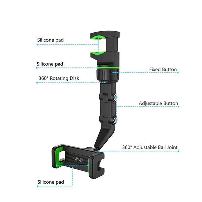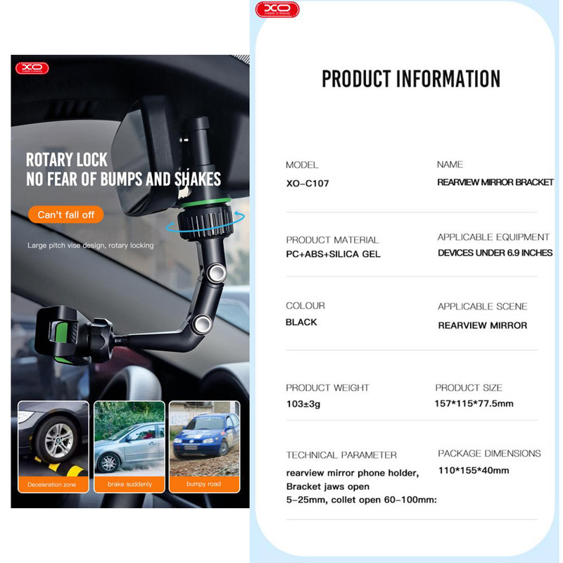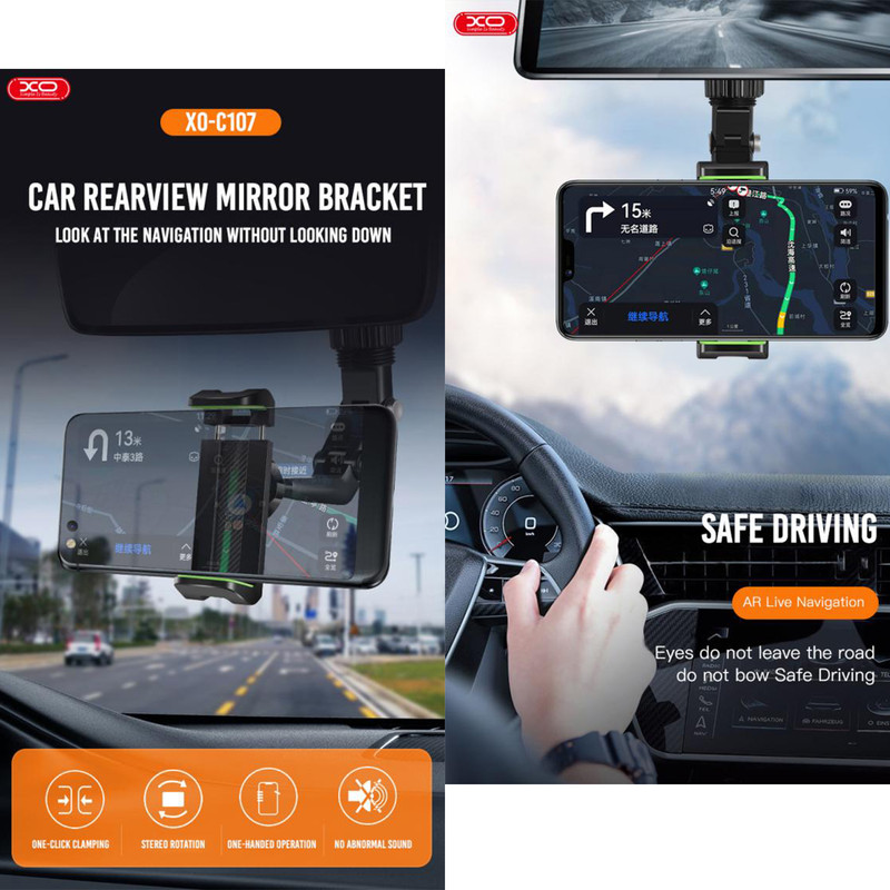 هولدر XO C107 هولدری است که به آینه وسط خودرو متصل شده و بازوی قابل تنظیم دارد. هولدر در ماشین نیاز بسیاری از کاربران بوده که با استفاده از آن می توانند به راحتی به گوشی موبایل خود دسترسی داشته و کنترل موزیک، نقشه، و ... را در اختیار داشته باشید.