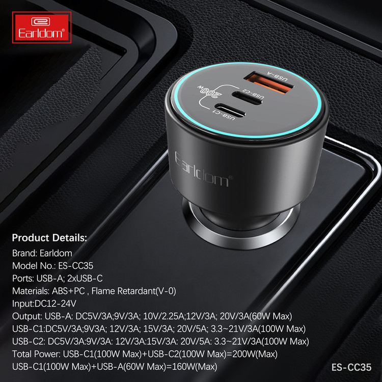 شارژر فندکی 200 وات 3 پورت ارلدام مدل CC35