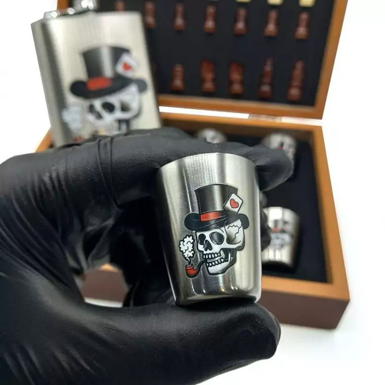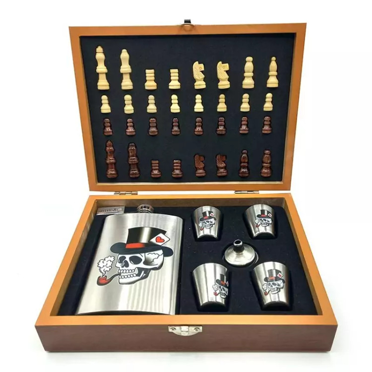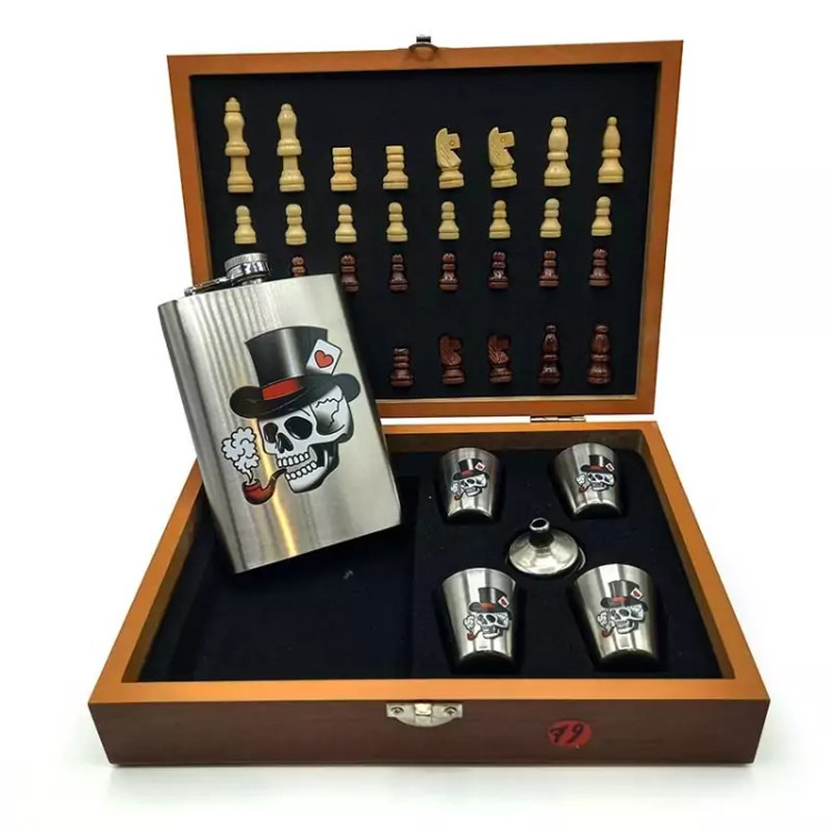 ست قمقمه جیبی و جعبه چوبی شطرنج طرح جمجمه کد a560557