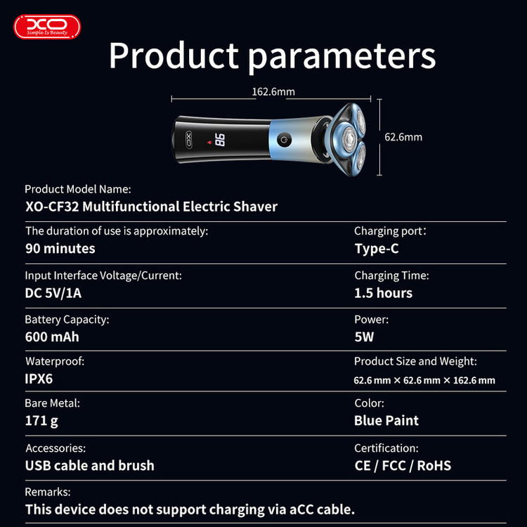 ریش تراش چند کاره ایکس او XO-CF32 با طراحی مدرن و ویژگیهای منحصر به فرد، گزینهای ایدهآل برای آقایانی است که به دنبالیک دستگاه کامل برای اصلاح و نگهداری از ظاهر خود هستند. این ریش تراش با قابلیتهای متنوع و کارایی بالا، به شما تجربهای راحت و بدون دردسر در اصلاح میدهد.ریش تراش XO-CF32 با یک بار شارژ کامل میتواند تا 90 دقیقه کار کند. این زمان کافی به شما اجازه میدهد تا بدون نگرانی از اتمام شارژ، اصلاحی کامل و دقیق داشته باشید.این دستگاه دارای ورودی شارژ TYPE-C با ولتاژ و جریان DC 5V/1A است. زمان شارژ کامل این دستگاه تنها 1.5 ساعت میباشد که به شما این امکان را میدهد که ریش تراش خود را سریعاً شارژ کنید.باتری لیتیوم یونی ICR14500 با ظرفیت 600 میلیآمپر ساعت و ولتاژ 3.7 ولت، قدرت و دوام بالایی را ارائه میدهد و اطمینان میدهد که دستگاه حتی در استفادههای طولانی مدت عملکردی ثابت و قوی خواهد داشت.ریش تراش XO-CF32 مجهز به موتور FF-260PA-21114V-33 با ولتاژ DC 3.7V و توان 5 وات است که عملکردی قوی و پایدار را تضمین میکند.این دستگاه دارای استاندارد ضد آب IPX6 است که به شما امکان میدهد آن را به راحتی زیر آب بشویید و در محیطهای مرطوب نیز استفاده کنید.این ریش تراش با سطح نویز زیر 45 دسیبل در محیط و حداکثر 60 دسیبل در فاصله 30 سانتیمتری از تیغه، یکی از کمصداترین ریش تراشها در بازار است.ریش تراش XO-CF32 در رنگ آبی زیبا عرضه شده و همراه با کابل USB و برس تمیزکننده ارائه میشود.