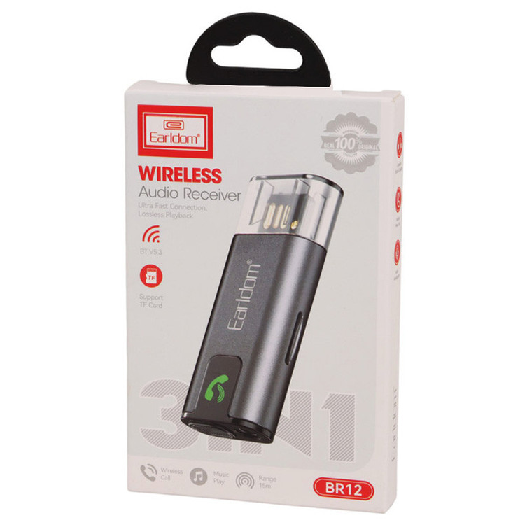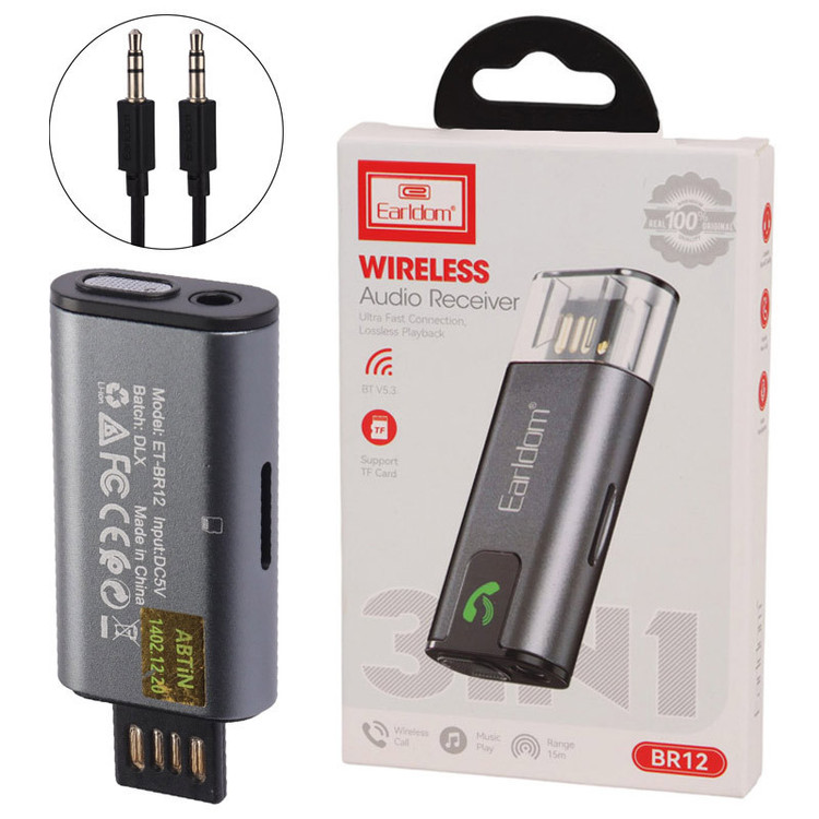 گیرنده بلوتوث ماشین و رم ریدر ارلدام مدل ET-BR12 سازگار با فرمت های صوتی شامل MP3 ،WAV ،FLAC ،WMA و پشتیبانی از کارت حافظه میکرو SD و جک 3.5 میلی متری صدا و مجهز به میکروفون داخلی جهت پاسخ دهی به تماس های دریافتی ، دریافت موسیقی از طریق بلوتوث نسخه 5.3 با برد اتصال حدود 15 متر ، به همراه کابل AUX ساخته شده از جنس TPE مقاوم در برابر کشش و پارگی ، بدنه ساخته شده از جنس پلاستیک ABS و PC مقاوم در برابر ضربه و فشار احتمالی ، دارای رابط اتصال از نوع USB جهت تامین انرژی و اتصال به ضبط خودرو و دستگاه های سازگار