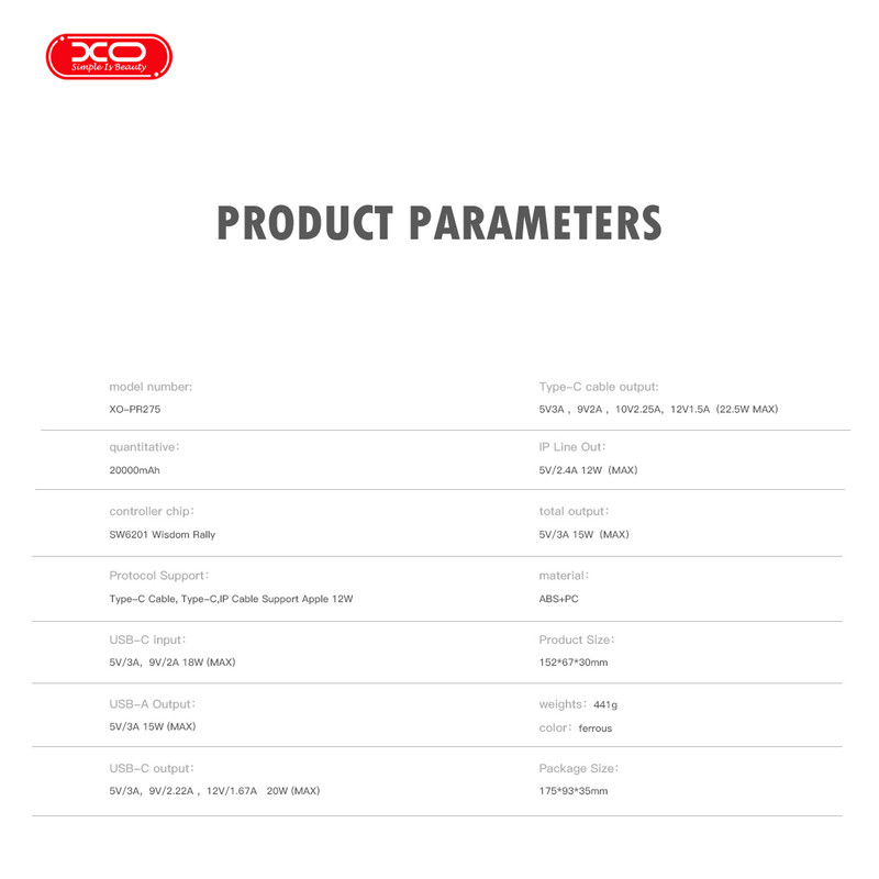 پاوربانک XO‑PR275 یک شارژر همراه با ظرفیت ۲۰هزار میلیآمپر ساعت است که طراحی جمعوجور، وزن مناسب و توان شارژ سریع را یکجا دارد. این مدل با داشتن چندین خروجی شامل USB‑A، USB‑C، کابل Type‑C متصل و خروجی لایتنینگ، میتواند همزمان چند دستگاه را شارژ کند.