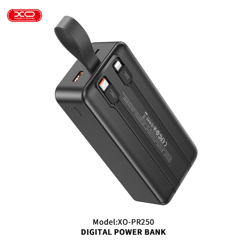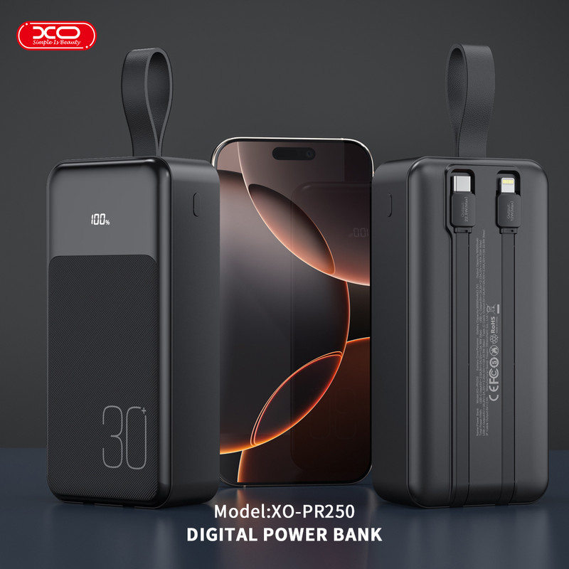 پاوربانک XO‑PR250 یک شارژر همراه قدرتمند و پرظرفیت است که با ظرفیت واقعی ۳۰هزار میلیآمپر ساعت (۳ سلول باتری لیتیوم پلیمری) نیاز شما به پریز برق را برای چند روز کامل برطرف میکند.