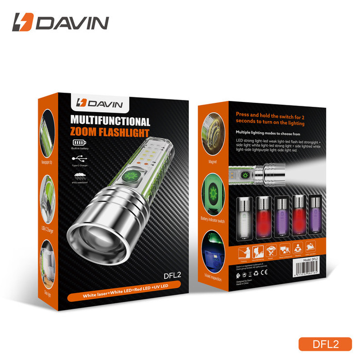 چراغ قوه زوم دار داوین مدل DFL2 محصولی با طراحی نوین ، زیبا و بسیار کاربردی است که آن را به یک همراه چند منظوره و ضروری برای خانه ، کمپینگ ، کوهنوردی و ... تبدیل کرده است . این چراغ قوه دارای قابلیت زوم می باشد که با استفاده از آن می توانید نور را بر روی یک نقطه دور متمرکز کنید و یا اینکه شعاع نور را برای دیدن اشیا نزدیک بیشتر کنید . این چراغ قوه شارژی می باشد و با پورت USB تایپ سی شارژ می شود که به راحتی و در همه جا با استفاده از پاوربانک نیز شارژ می شود . از دیگر ویژگی های برجسته این محصول می توان به دارا بودن 7 حالت نوری شامل نور قوی ، متوسط ، فلشر و چشمک زن ، نور جانبی ، نور قرمز و آبی چشمک زن است و نور UV جهت تخیص اسکناس تقلبی کاربرد دارد اشاره نمود . بدنه آن مقاوم و بسیار با کیفیت است و دارای گواهینامه ضد آب و ضد گرد و غبار IPX5 می باشد که حتی زیر باران هم قابل استفاده است و همراه آن بند آویز مچی و گیره خودکاری برای سهولت در جابه جایی و نگهداری در نظر گرفته شده است . درون این محصول ، یک چراغ ال ای دی قرار گرفته که دارای نور بسیار قوی می باشد .اما شیشه رویی این چراغ یک شیشه معمولی نیست ، بلکه یک عدسی با قابلیت حرکت به سمت جلو و عقب می باشد . این عدسی به شما امکان زوم کردن نور را می دهد ، به عبارت دیگر می توانید نورچراغ قوه را در یک نقطه متمرکز کنید و از سویی دیگر قادر خواهید بود شعاع نور آن را افزایش دهید و برای این کار تنها کافیست سری کشوی را به سمت جلو و یا عقب حرکت دهید . از دیگر قابلیت های کاربردی این چراغ قوه ، وجود آهن ربای قوی در قسمت پایانی آن است که می توان آن را به اجسام آهنی مانند بدنه خودرو چسباند .