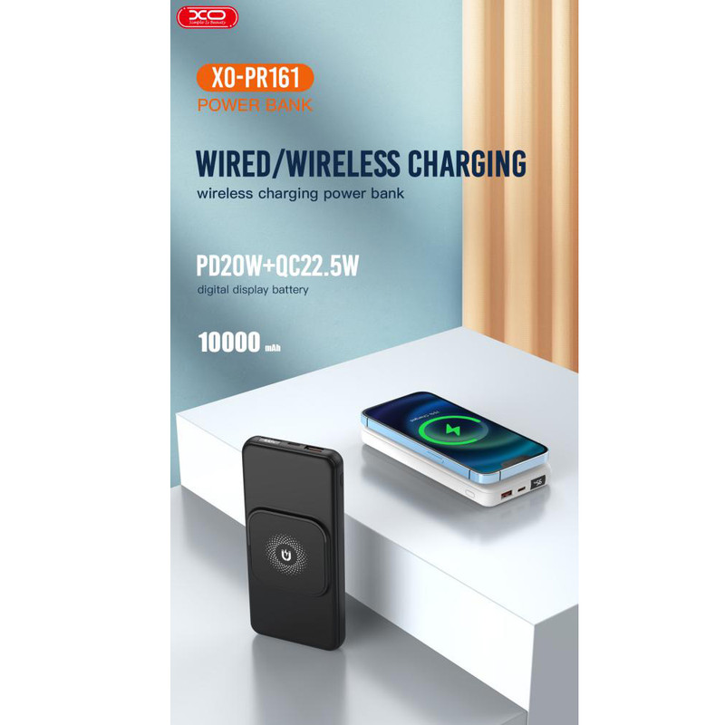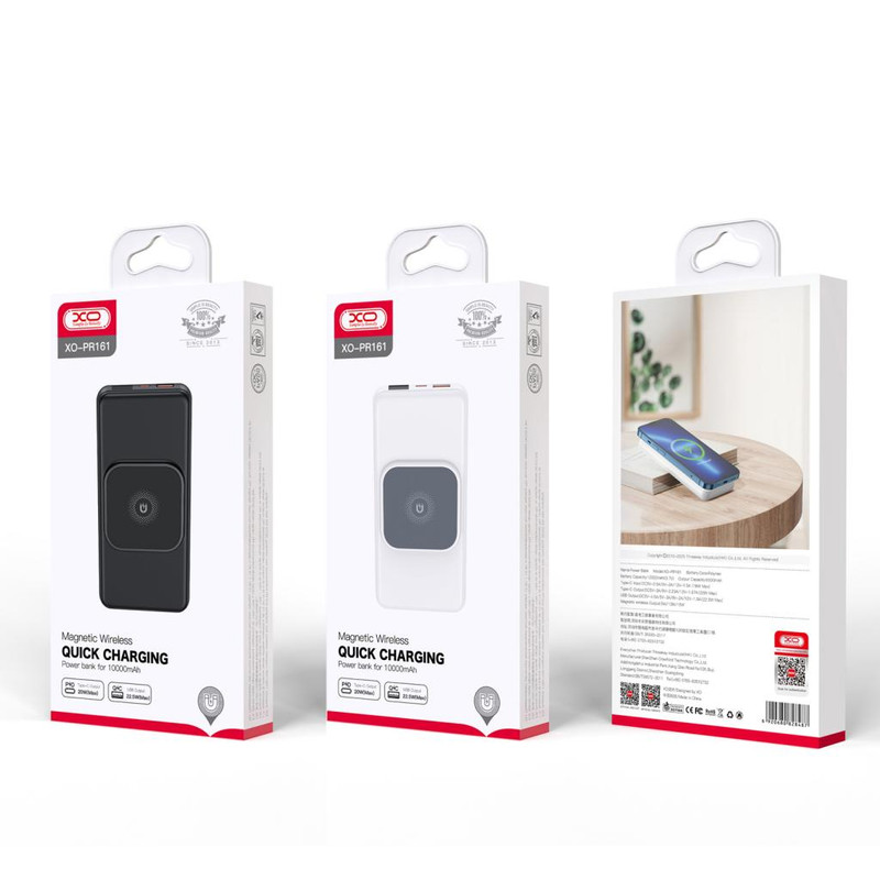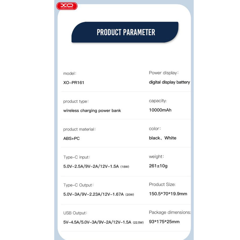 پاوربانک وایرلس ایکس او PR161 از ABS و PC ساخته شده است. ابعاد آن برابر 150.5x70x19.9 میلیمتر و وزنی در حدود 261 گرم دارد.