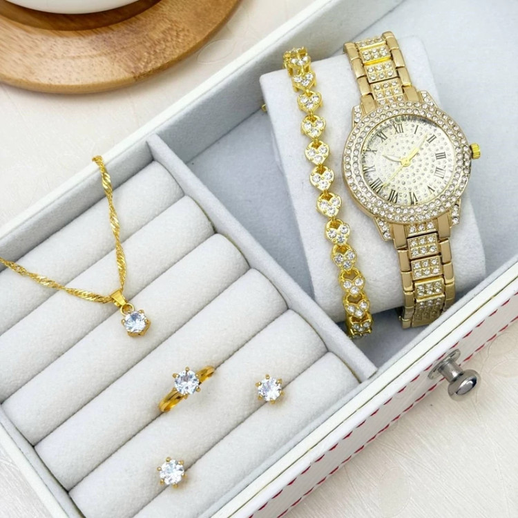 ست ساعت مچی زنانه پرنگین همراه دستبد، گردنبند، انگشتر، گوشواره در سه رنگ طلایی، نقره ای، رزگلد کد: unik25412