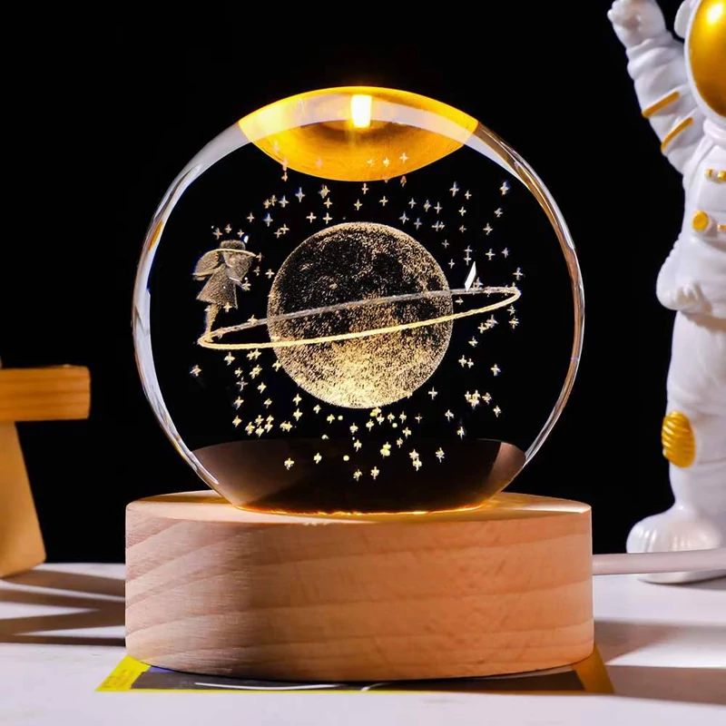 چراغ خواب گوی کریستالی طرح ماه و فرشته سایز 6 با پایه چوبی و کلید پاور
