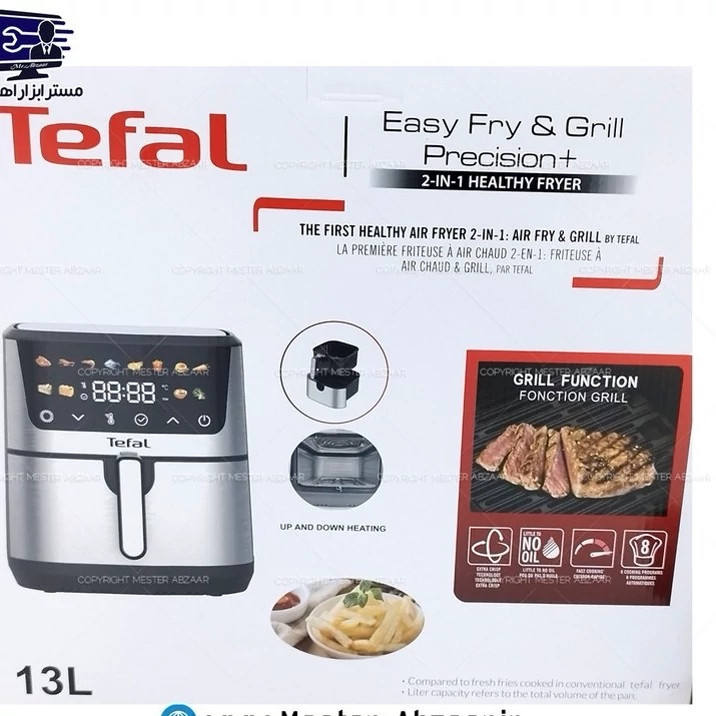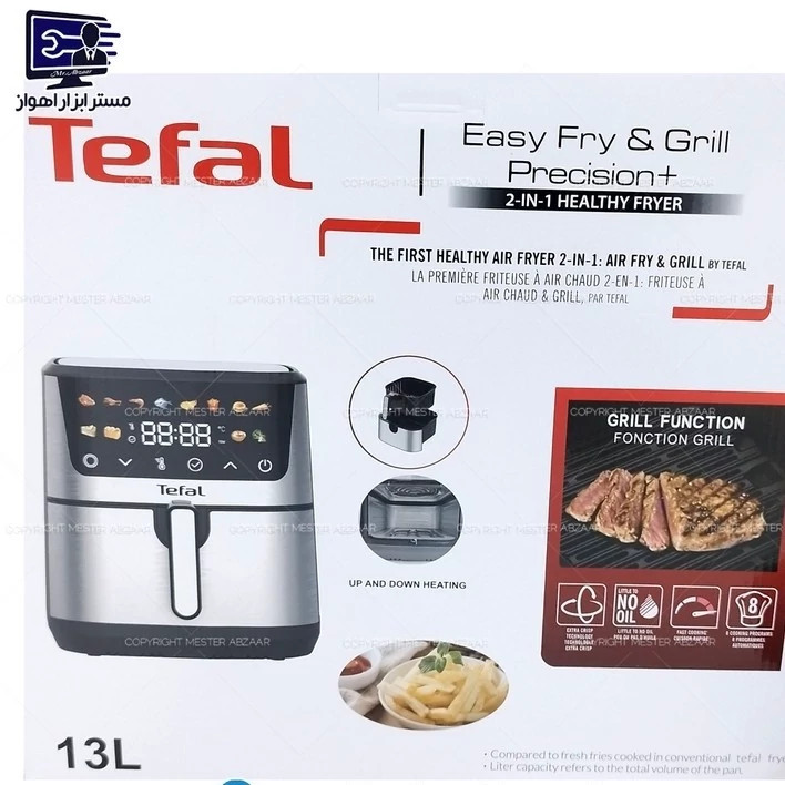 سرخ کن هواپز 13 لیتری لمسی دو 2 المنت بدون روغن 2300 وات دیجیتالی تفال بزرگ سرخکن همراه سبد جدا شونده صفحه رنگی مدل TEFAL 808 این دستگاه مدل 808 و توان 2300 وات قدرت دارد. جنس بدنه از ترکیب پلاستیک مستحکم مرغوب میباشد. دارای دو المنت پر قدرت. یکی در سقف و یکی در کف دستگاه این محصول ساخت شرکت تفال با کیفیت بسیار بالا بوده و به دلیل ارزان بودن نیروی کار در کشور چین مونتاژ و تولید میشود. صحفه نمایشگر سرخ کن لمسی است در حالی که در سایر فروشگاه ها، مدل پایین تر و عقربه ای را به این قیمت میفروشند با این سرخ کن دیگر نیازی به روغن اضافی نیست و میتوانید بدون روغن یا مقدار بسیار کمی روغن شروع به درست کردن مواد غذایی خود نمایید و برای همیشه از دست روغن های مضر راحت شوید. در داخل محفظه سرخ کن یک عدد فن قرار دارد که در هنگام استفاده از سرخ کن شروع به کار می کند و باعث میشود تا گردش هوای سریع و یکنواخت به مواد غذایی درون سرخ کن بدهد. دارای 12 برنامه متنوع جهت پخت و پز انواع غذاها دارای صفحه نمایش و لمس رنگی دارای قابلیت سبد جداشونده مخزن 13 لیتری توان 2300 وات درج شده ساخت چین
