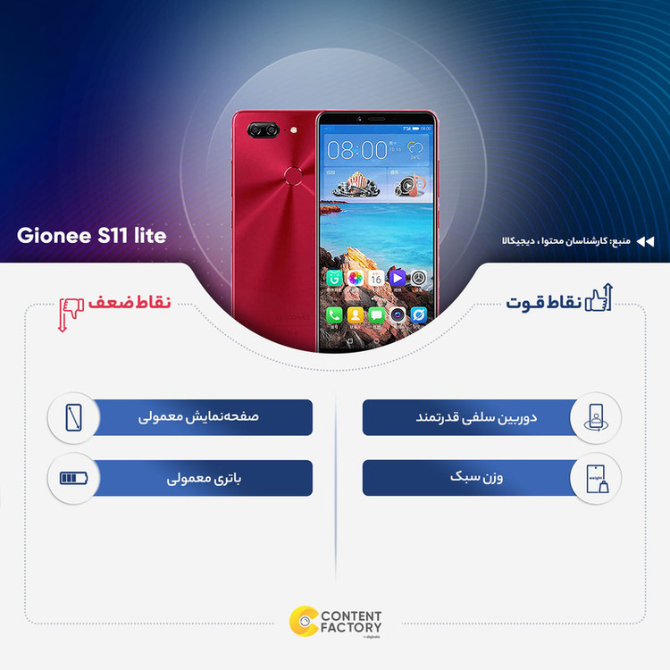 برند جیونی از برندهای کمتر شناخته شده در ایران است که کاربران اندکی آن را میشناسند اما محصولات آن به نسبت ویژگیها و کارایی گزینههای مقرون به صرفه شمار میروند. گوشی موبایل جیونی مدل S11 lite دو سیم کارت ظرفیت 64 گیگابایت و رم 4 گیگابایت یکی از محصولات این برند است که اواخر سال 2017 معرفی و در سال 2018 به بازار آمد. نباید از این موبایل توقع استفادهی حرفهای یا انجام بازیهای سنگین بدون لگ و پرش داشته باشید چرا که تراشه Qualcomm MSM8937 اسنپ دراگون و اندروید نسخه 7.1 برای استفادههای روزمره کافی و مناسب خواهند بود. وزن 141 گرمی این موبایل دست شما را در استفادههای طولانی مدت خسته نخواهد کرد. علاوه بر این مدل s11 قابلیتهای کاربردی مناسبی دارد. از این ویژگیهای میتوان به حسگر اثر انگشت، دو حسگر دوربین با رزولوشن 13 و 2 مگاپیکسل، فیلمبرداری 1080 پیکسل 30 فریم بر ثانیه و صفحه نمایش IPS اشاره کرد. این موبایل دارای 64 گیگابایت حافظه داخلی و رم 4 گیگابایتی است و قابلیت استفاده از دو سیم کارت را دارد. اما در نظر داشته باشید که شیار کارت حافظه به صورت مجزا تعبیه نشده و برای استفاده از کارت حافظه جانبی لازم است یکی از سیم کارتها را از دستگاه خارج کنید.
