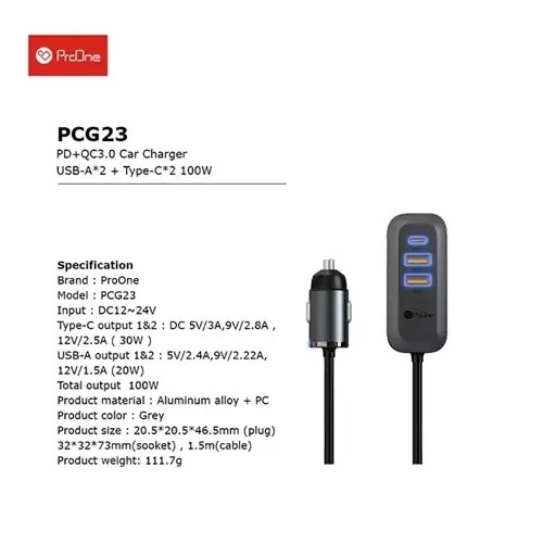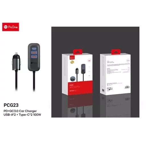شارژر موبایل داخل ماشین ProOne PCG23 Car Charge دارای دو خروجی تایپ سی و دو خروجی یو اس بی با حداکثر توان خروجی 100 وات است و امکان اتصال چهار دستگاه همزمان جهت شارژ با قابلیت شارژ سریع PD را فراهم میکند. ...