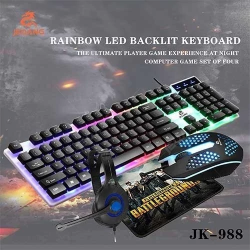 ست گیمینگ Jeqang مدل JK-988 شامل یک کیبورد و ماوس، هدست، پد موس مخصوص بازی با طراحی زیبا و با کیفیت ترکیبی فوق العاده برای کسانی هست که علاقه به بازی های حرفه ای دارند و شما می توانید با استفاده از آنها یک بازی هیجان انگیز را تجربه کنید.مدل JK-988 دارای یک صفحه کلید گیمینگ بزرگ سیمی با 104 کلید اصلی و میانبر که ابعاد 32×130×445 میلی متری با ساختار ارگونومیک به همراه یک بک لایت زیبا که هنگام اتصال در پس زمینه دکمه ها چراغی رنگارنگ روشن میشود و با تولید نور هفت رنگ در هنگام بازی در فضایی تاریک یا گیم نت ها جلوه خاصی به محیط می بخشد.