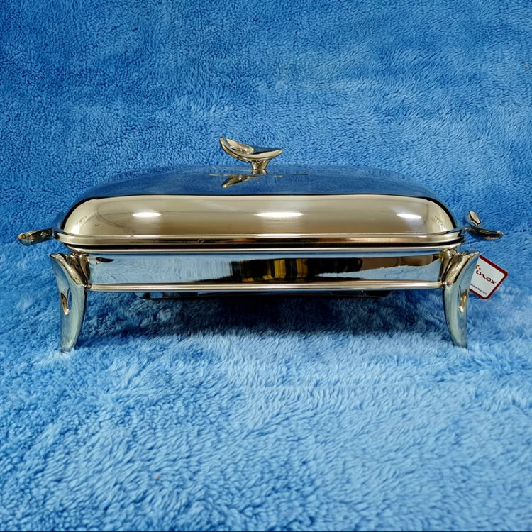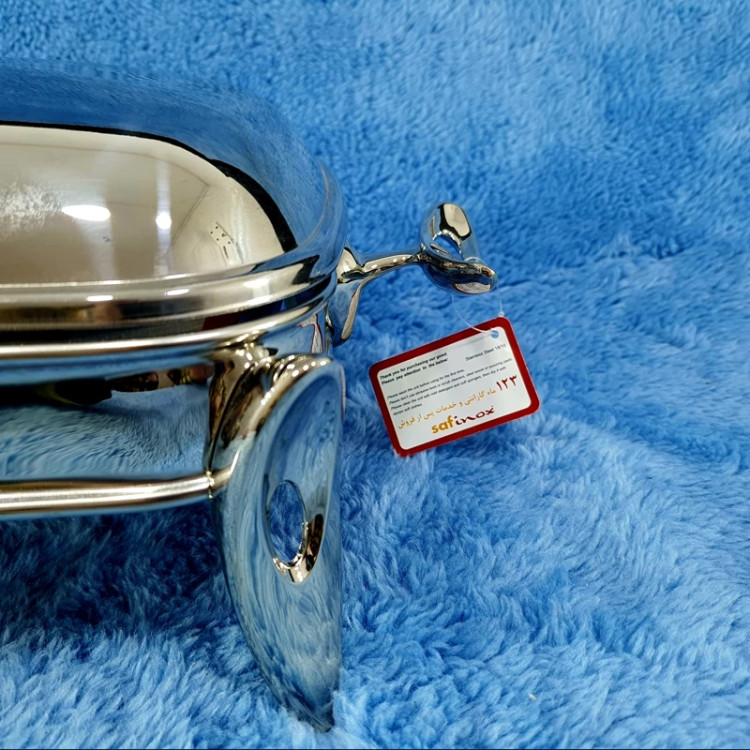 سوفله خوری بزرگ مستطیل برند safinox مدل فلیم براق کد 507 تولید شده با ورق استیل ضخیم و ضد زنگ 18٫10 با پایه و دسته هایی از جنس زاماک آبکاری شده و براق و ظرف پیرکس مارینکس برزیلی 39٫5×23٫5 سانت 2٫9 لیتری که در مقابل شوک حرارتی و ضربه ای مقاوم است و قابلیت قرارگیری در فر و مایکروویو و ماشین ظرفشویی را دارد تولید شده