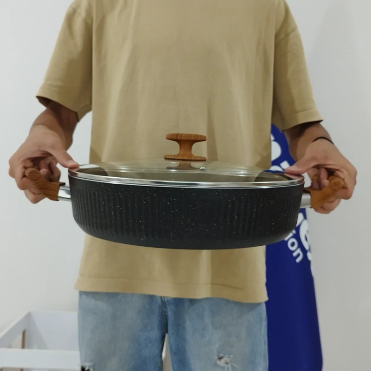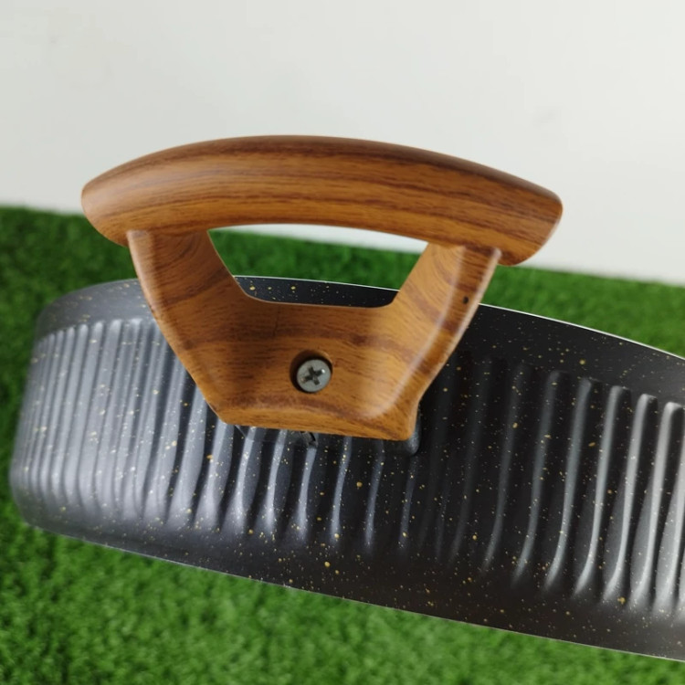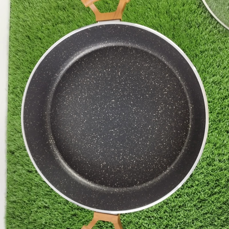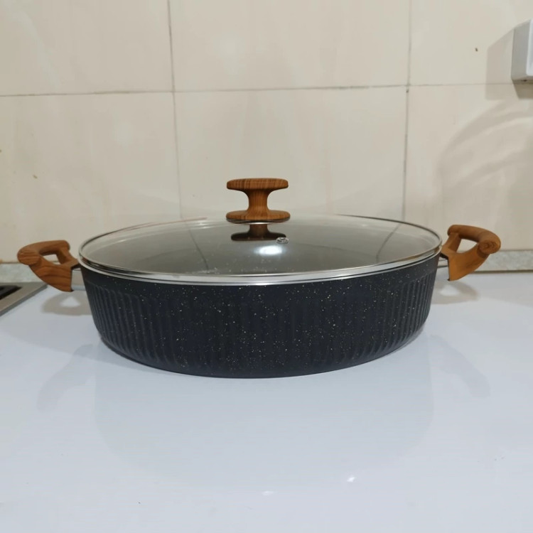 با دسته ای از جنس باکالیت نسوز که طراحی شبیه به چوب دارد و باعث زیبایی چندین برابری این تابه ی پر کاربرد شده