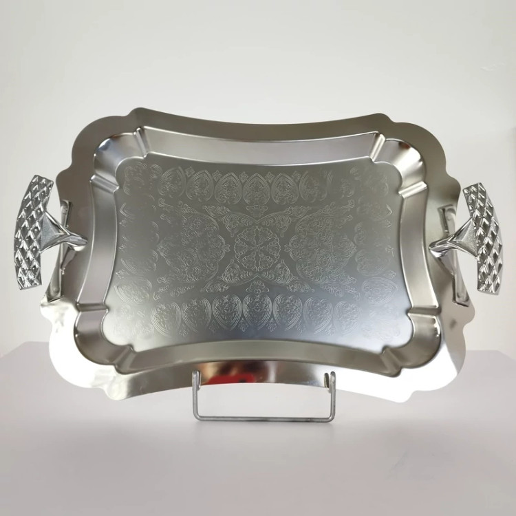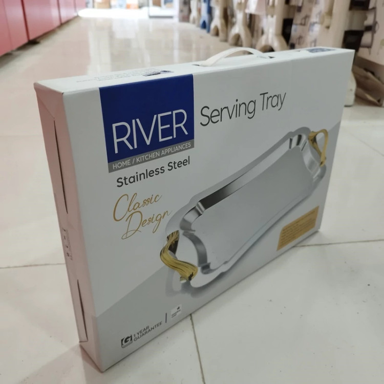 سینی های استیل 18/10 ضد زنگ ریور دارای ضخامت 0.8 ، داخل طرح دار ، پولیش تمیز بهمراه جعبه کادویی دسته دار و بسیار شیک درطرح ها و اندازه های مختلف جهت استفاده در مهمانی ها و دورهمی ها می باشد