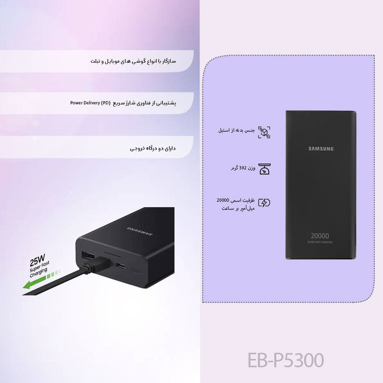 در عصر مدرن که تمامی کارهایی که باید در طول روز انجام شود به صورت اپ و در گوشی قرار گرفته است به یک شارژر همراه نیاز خواهیم داشت. البته این تنها استفادهی این محصول نیست و برای شارژ کردن لپتاپ و حتی تبلت نیز باید از همین مورد استفاده کنید. تصور کنید هر روز بعد از کار باید با تبلت در کلاس آنلاین خود شرکت کنید، در این صورت زمانی که از سرویس برگشت شرکت استفاده میکنید به صورت همزمان در کلاس خود حاضر میشوید و با استفاده از پاوربانک از تمام نشدن شارژ تبلت اطمینان حاصل میکنید. شارژر همراه سامسونگ مدل EB-P5300 در ظرفیت 20000 میلیآمپر تولید و عرضه میشود و به شما این امکان را میدهد تا دو دستگاه مجزا را به صورت همزمان شارژ کنید. این محصول این امکان را به شما میدهد تا از فناوری شارژ سریع استفاده کنید و بدنهی این محصول برای اطمینان از مقاوم بودن آن از فلز ساخته شده است.