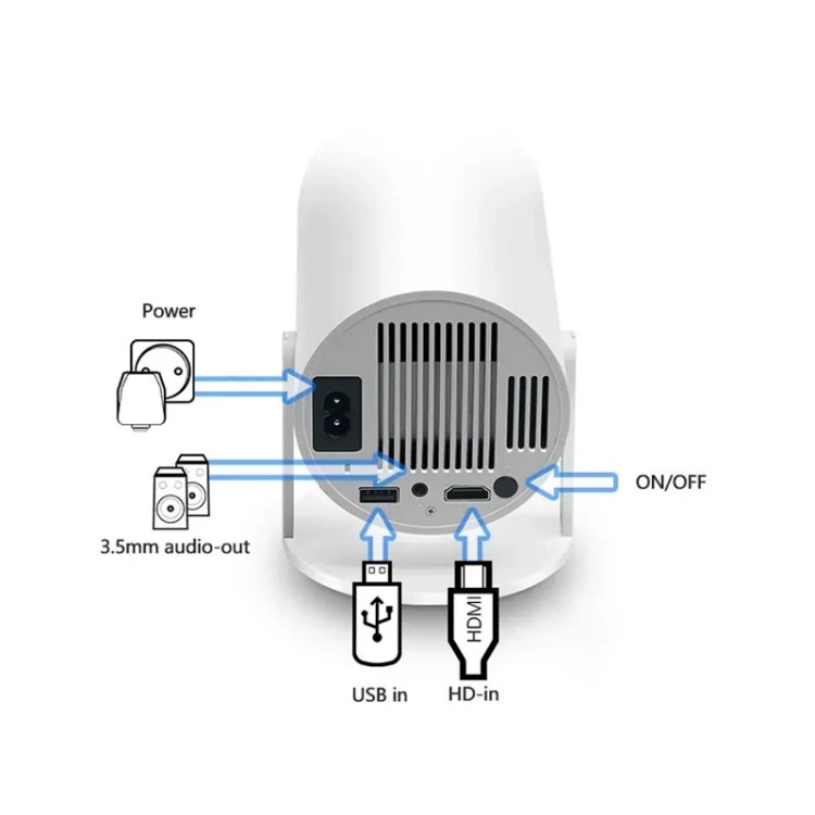 در پشت این دستگاه، ورودی AC وجود دارد که با برق شهری میتوان آن را روشن کرد. یک پورت USB نیز برای این دستگاه تعبیه شده است که میتوان از طریق اتصال یک هاب USB، به صورت همزمان چندین حافظه و یا ماوس و کیبرد را به دستگاه متصل کرد. در کنار پورت یو اس بی نیز درگاه AUX قرار دارد که برای اتصال اسپیکر و هدفون به صورت سیمی، کاربرد دارد. از دیگر پورت های این پروژکتور، HDMI می باشد که میتواند از دستگاه هایی که خروجی HDMI دارند، تصاویر را دریافت کرده و نمایش دهد.