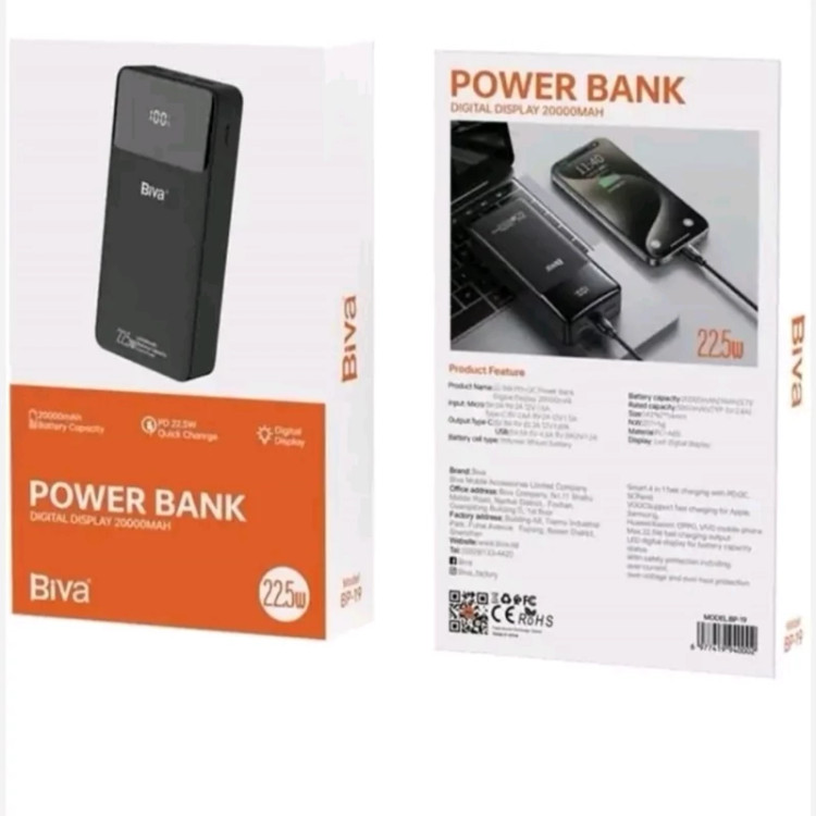 پاور بانک 20000 بیوا دارای سه پورت فست دارای صفحه نمایش ( خرید عمده پاور بانک گناوه مارکت )