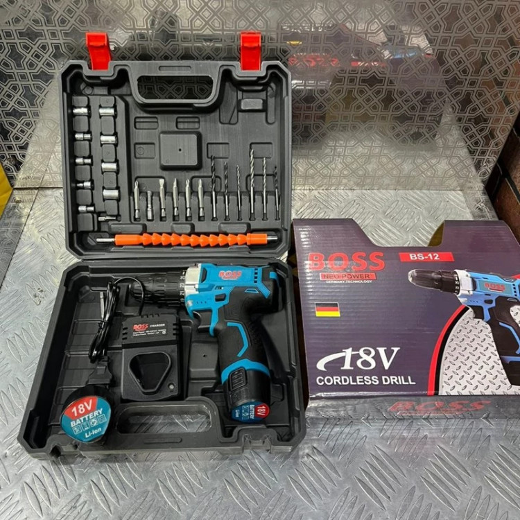 دریل شارژی 18 ولت باس دو باتری با لوازم ست دریل ( خرید عمده ابزار برقی و ابزار دستی از بندر گناوه )