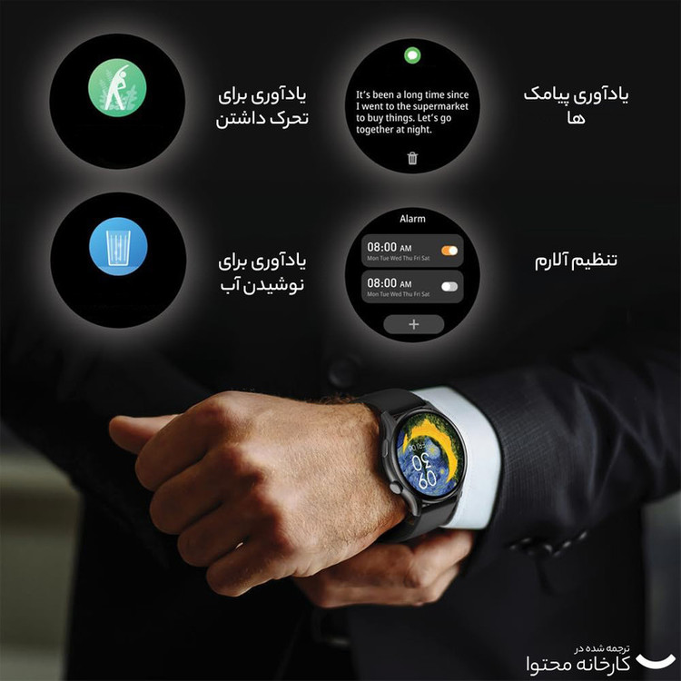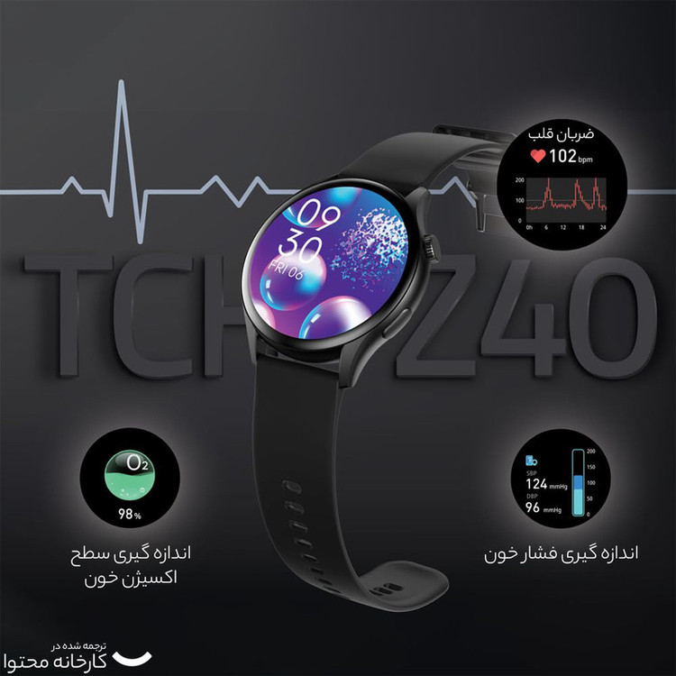 قابلیتهای ساعت هوشمند : صفحه نمایش رنگی , صفحه نمایش لمسی , کنترل سطح اکسیژن خون , پشتیبانی از زبان فارسی در منو و سیستمعامل