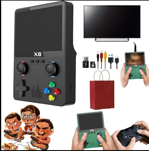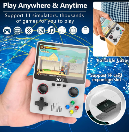 کنسول بازی دستی X6 بیش از 10000 بازی کلاسیک از قبل بارگذاری شده بر روی رم خود دارد، از یک تجربه بازی بدون دردسر لذت ببرید.این کنسول دارای کارت حافظه داخلی از نوع TF با حافظه 32 گیگابایت می باشد کنسول بازی دستی X6 Retro از 11 شبیهساز و فرمتهای مختلف از قبیل ، GBC، GBA، GB، FC، NES، MD، MAME، SMC، CPS، SMD، برای دانلود بازی پشتیبانی میکند. در صورتی که بازی مورد علاقه شما جزو بازیهای موجود بر روی کنسول نبود میتوانید بازیهای بیشتری را بر روی حافظه موجود بر روی کنسول دستی یا یک کارت حافظه دیگر بریزید و آن را اجرا نمایید. برای همین بازی ها هرگز برای شما تکراری نخواهد شد.