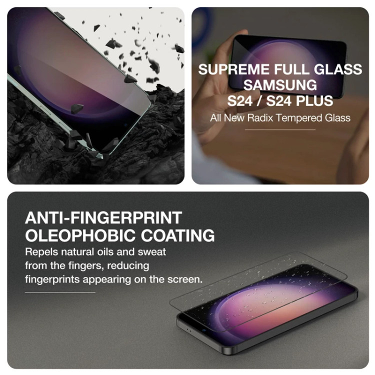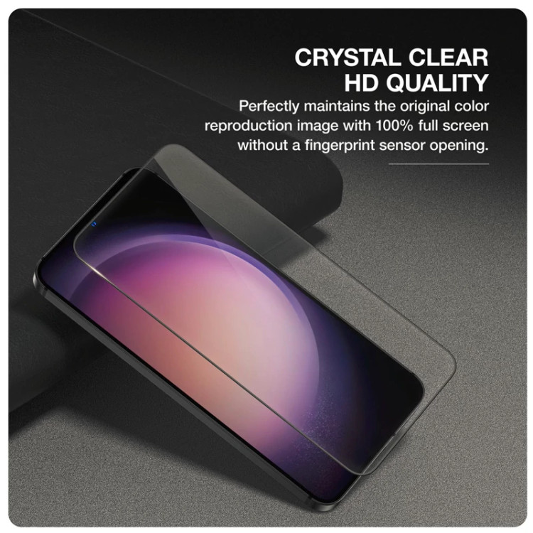 این محافظ صفحه نمایش کاملاً شفاف با پوشش کامل از جنس شیشه حرارتدیده و گوشههای خمیده طراحی شده است و با مقاومت بالای H9 در برابر ضربه میتواند کل صفحه نمایش گوشیهای Samsung S24 Plus شما را پوشش دهد.