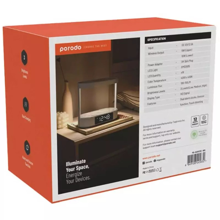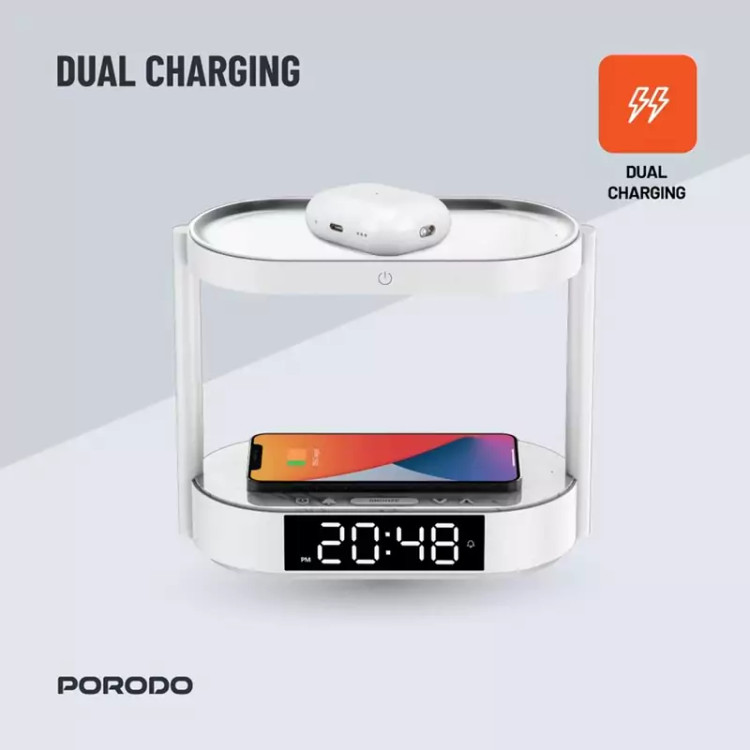پورودو محصولی چندکاره طراحی کرده که شامل شارژر بیسیم، چراغ خواب و ساعت دیجیتال رومیزی است. این وسیله با طراحی بسیار زیبا، به عنوان یک اکسسوری جذاب برای کنار تخت یا میز کار شما مورد استفاده قرار میگیرد.