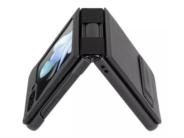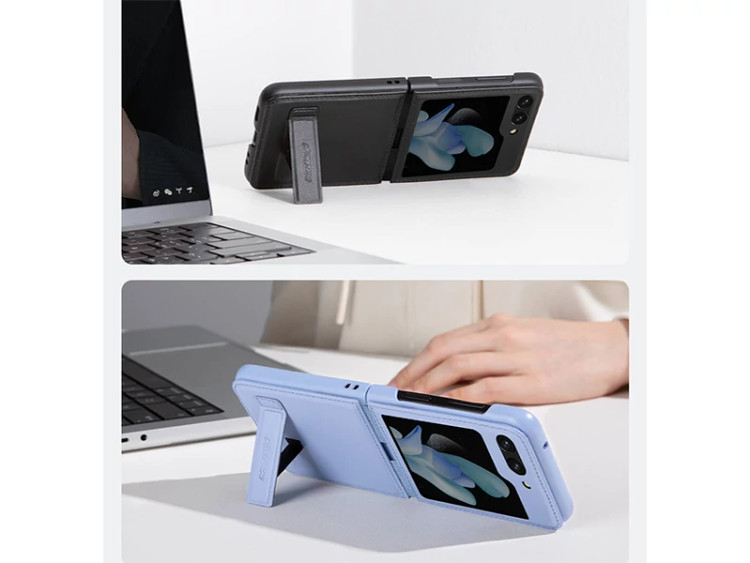 قاب Nillkin Qin Vegan Leather مجهز به براکت چرمی با آهنربای داخلی است که به شما این امکان را میدهد تا دستانتان آزاد باشد و به تماشای ویدئو با گوشی Galaxy Z Flip5 بپردازید. همچنین این محصول به راحتی پس از تا شدن روی قاب چرمی محکم میشود.