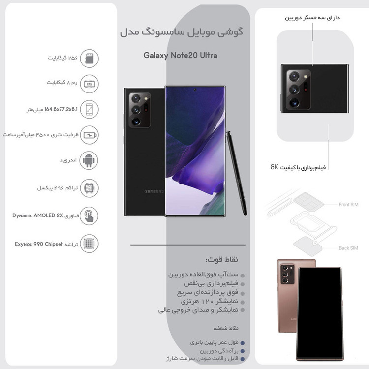 سری Note پرچمداران سامسونگ همواره با بهره بردن از مشخصات فنی قدرتمند و قابلیتهای خاص، طرفداران بسیاری در میان کاربران دارند. Galaxy Note20 Ultra هم یکی از قدرتمندترین گوشیهای هوشمند این سری است که مشخصات فنی قدرتمند و قابلیتهای بسیار جذابی را با خود بههمراه داشته است. در نمای روبهرویی این گوشی به صفحهنمایش بسیار زیبا و باکیفیت 6.9 اینچ با رزولوشن 1440×3088 پیکسل از نوع Dynamic AMOLED 2X مجهز شده است. صفحهنمایشی که از جمله ویژگیهای قدرتمند آن، میتوان به توانایی ارائه نرخ بروزسانی 120 هرتز اشاره کرد. در قسمت پشتی هم یک سنسور دوربین اصلی با رزولوشن 108 مگاپیکسل از نوع عریض در کنار سنسور 12 مگاپیکسل از نوع پریسکوپ و سنسور 12 مگاپیکسل از نوع فوق عریض (ultra wide)، سنسورهای دوربین سهگانه سامسونگ Galaxy Note20 Ultra را تشکیل میدهند. سنسور دوربین پریسکوپ این گوشی هوشمند توانایی زوم 5 برابری اپتیکال (زوم بدون کم شدن کیفیت تصویر) و زوم 50 برابری هیبرید را دارد. برای دوربین سلفی هم سنسور 10 مگاپیکسل از نوع عریض در نظر گرفته شده است که توانایی ضبط ویدیو با حداکثر کیفیت 4K و سرعت 60 فریم در ثانیه را دارد. در بخش مشخصات سختافزاری هم این گوشی پرچمدار به در دو مدل با پردازندههای اسنپدراگون 865 شرکت کوالکام و اگزینوس 990 شرکت سامسونگ روانه بازار شد. البته نسخه جهانی این گوشی به پردازنده اگزینوس 990 سامسونگ مجهز شده که بازار ایران را هم شامل میشود. بهره بردن از چنین پردازنده قدرتمندی سبب شده تا با خیال راحت هر بازی حتی سنگین را هم روی این گوشی اجرا کنید و از گیمپلی جذاب در کنار صفحهنمایش قدرتمند با توانایی ارائه نرخ بروزرسانی 120 هرتز لذت ببرید. باتری با میزان ظرفیت 4500 میلیآمپرساعت در کنار شارژر 25 وات با توانایی پشتیبانی از فناوری شارژ سریع، از دیگر مشخصات در نظر گرفته شده برای این گوشی هوشمند پرچمدار است.