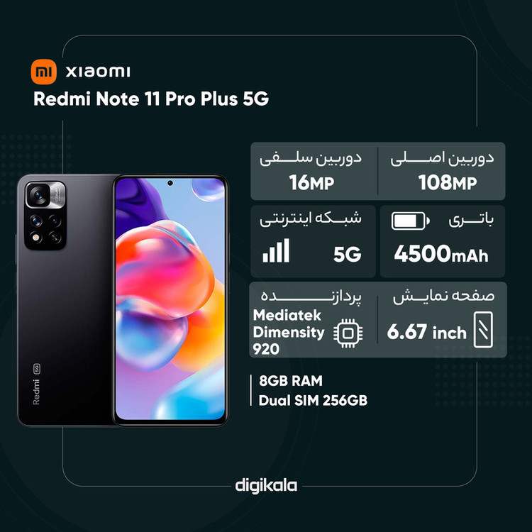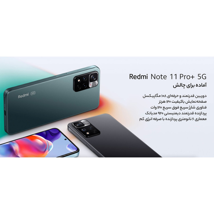 شیائومی Redmi Note 11 Pro Plus 5G را میتوان به عنوان یکی از گوشیهای هوشمند قدرتمند این شرکت دانست که به لطف بهره بردن از مشخصات فنی مناسب، توانایی ارائه عملکرد بسیار خوبی را دارد. در همان نگاه اول، این گوشی با توجه به طراحی در نظر گرفته شده سعی دارد تا خود را بهعنوان یک گوشی پرچمدار معرفی کند. شیائومی Redmi Note 11 Pro Plus 5G به صفحهنمایش با ابعاد 6.67 اینچ و رزولوشن 1080×2400 پیکسل از نوع سوپرامولد مجهز شده است. توانایی نمایش 395 پیکسل در هر اینچ و نرخ بروزرسانی 120 هرتز نشان از آن دارد که با صفحهنمایش بسیار قدرتمند و باکیفیت روبهرو هستیم. حداکثر روشنایی 1200 نیت (شمع در متر مربع) این صفحهنمایش هم سبب شده تا در شرایط نوری متنوع، وضوح تصویر بسیار خوبی را شاهد باشید. در قسمت پشتی هم یک سنسور دوربین اصلی قدرتمند با رزولوشن 108 مگاپیکسل از نوع عریض (wide) در کنار سنسور 8 مگاپیکسل فوق عریض (ultrawide) و سنسور 2 مگاپیکسل از نوع ماکرو، سنسورهای دروبین سهگانه این گوشی هوشمند را تشکیل میدهند. برای دوربین سلفی هم سنسور با رزولوشن 16 مگاپیکسل در نظر گرفته شده است. اما در بخش مشخصات سختافزاری، یکی از قدرتمندترین پردازندههای شرکت مدیاتک، یعنی دیمنسیتی 920 در نظر گرفته شده که این پردازنده سوای عملکرد بسیار خوب در اجرای بازیهای سنگین مثل کالآفدیوتی موبایل و آسفالت 9، سبب شده تا این گوشی توانایی پشتیبانی از شبکههای اینترنتی پرسرعت نسل پنجم یا همان 5G را داشته باشد. باتری با میزان ظرفیت 4500 میلیآمپرساعت در کنار شارژر فوق قدرتمند 120 وات مجهز به تکنولوژی شارژ سریع، از دیگر مشخصات در نظر گرفته شده برای شیائومی Redmi Note 11 Pro Plus 5G هستند.