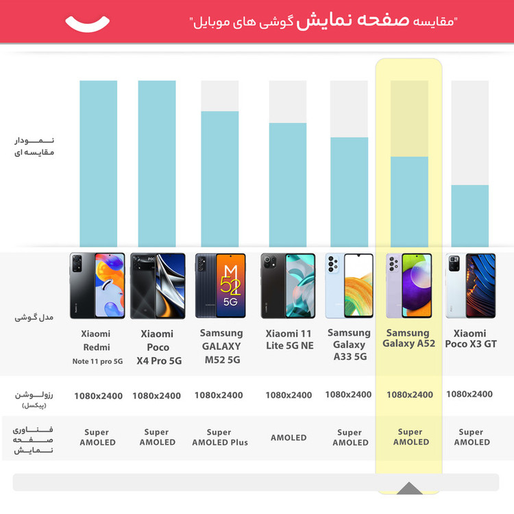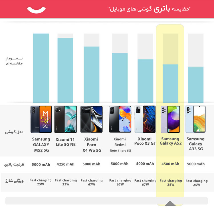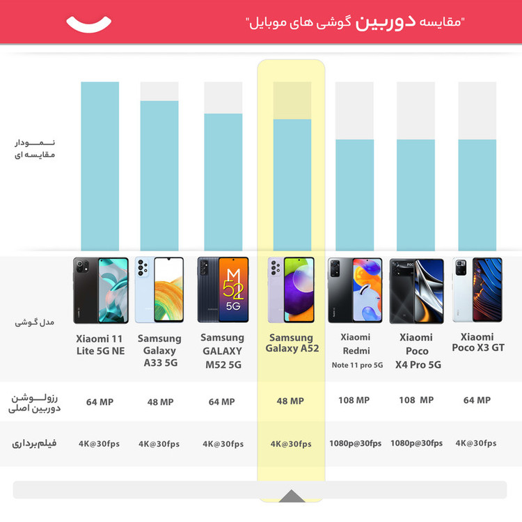 میانردههای سری A سامسونگ با توجه به تنوع بالایی که دارند، میتوانند پاسخگوی سلیقههای متنوع باشند. در بین این گوشیهای هوشمند، شاهد رونمایی محصولاتی بودیم که در برخی از مشخصات فنی در نظر گرفته شده، حتی چیزی کم از یک پرچمدار نداشتند. سامسونگ Galaxy A52 هم یکی از این گوشیهای هوشمند است. در نمای روبهرویی صفحهنمایش جذاب و قدرتمند 6.5 اینچ و رزولوشن 1080×2400 پیکسل را شاهد هستیم که از جمله قابلیتهای قدرتمند این صفحهنمایش که سبب شده تا کیفیت بسیار خوبی را ارائه کند، توانایی نمایش 407 پیکسل در هر اینچ و نرخ بروزرسانی 90 هرتز است. یک سنسور دوربین عریض (wide) با رزولوشن 64 مگاپیکسل در کنار سنسور 12 مگاپیکسل فوق عریض (ultrawide) و دو سنسور با رزولوشن 5 مگاپیکسل از نوع ماکرو و سنجش عمق، سنسورهای دوربین این گوشی را تشکیل میدهند که در نور روز و حتی نور شب، تمام توقعات شما را در حد و اندازه یک گوشی میانرده و حتی بالاتر را برآورده میکنند. برای دوربین سلفی هم سنسور قدرتمند 32 مگاپیکسل در نظر گرفته شده است که توانایی ضبط ویدیو با حداکثر کیفیت 4K را دارد و از این نظر، یکی از قدرتمندترین سنسورهای دوربین سلفی در بین گوشیهای هوشمند است. حضور پردازنده قدرتمند اسنپدراگون 720G شرکت کوالکام هم سبب شده تا این گوشی در اجرای بازیهای سنگین مثل کالآفدیوتی موبایل، عملکرد بسیار خوبی داشته باشد. باتری 4500 میلیآمپرساعت هم به ازای هر بار شارژ صد درصدی، توانایی ارائه طول عمر مفید (زمان آماده بهکار) نزدیک به دو روز را در استفاده معمولی دارد. در مجموع اگر به دنبال خرید گوشی میانردهای هستید که هم از نظر ظاهر و هم در بخشهایی از مشخصات فنی، عملکردی در حد و اندازه یک گوشی پرچمدار را داشته باشد، سامسونگ Galaxy A52 میتواند یکی از بهترین انتخابهای ممکن باشد.