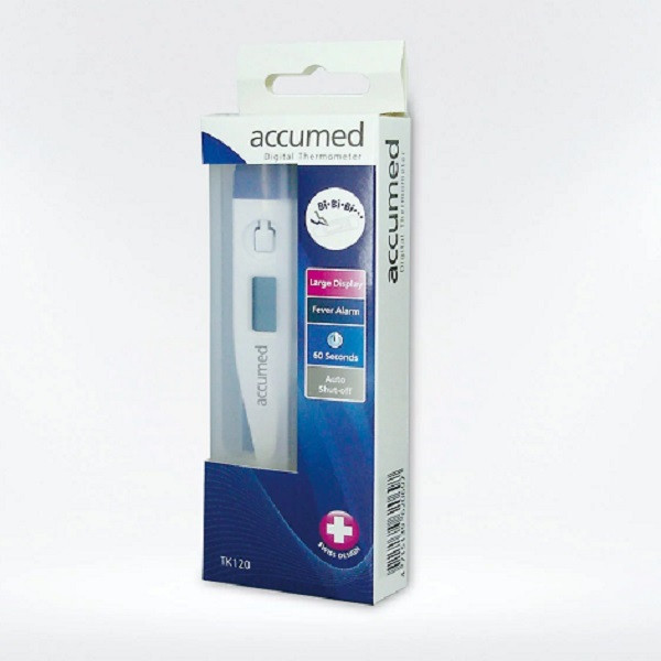 تب سنج دیجیتال اکیومد مدل TK250، این تب سنج جهت نشان دادن میزان دمای بدن و مقایسه آن در شرایط عادی و یا افزایش دما کاربرد دارد. این محصول ضدآب بوده و به راحتی می توان آن را شست و ضدعفونی کرد. دارای آلارم هشدار دهنده است که اگر دما غیر طبیعی باشد هشدار می دهد. دقت و سرعت بسیار بالایی دارد و کمتر از 10 ثانیه نتیجه را نمایش می دهد. دارای قابلیت خاموشی خودکار بوده و باعث می شود انرژی باتری مصرف پایینی داشته باشد. توسط این دما سنج می توان نتیجه را ذخیره کرد و با نتیجه های دریافتی مقایسه کرد. وزن بسیار سبک حدود 100 گرم است. شما می توانید از طریق زیر بغل یا دهان دمای بدن را اندازه گیری نمایید. توسط یک عدد باتری سکه ای کار می کند که تا 30 ساعت عمر دارد.