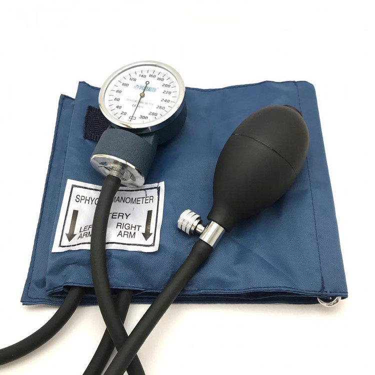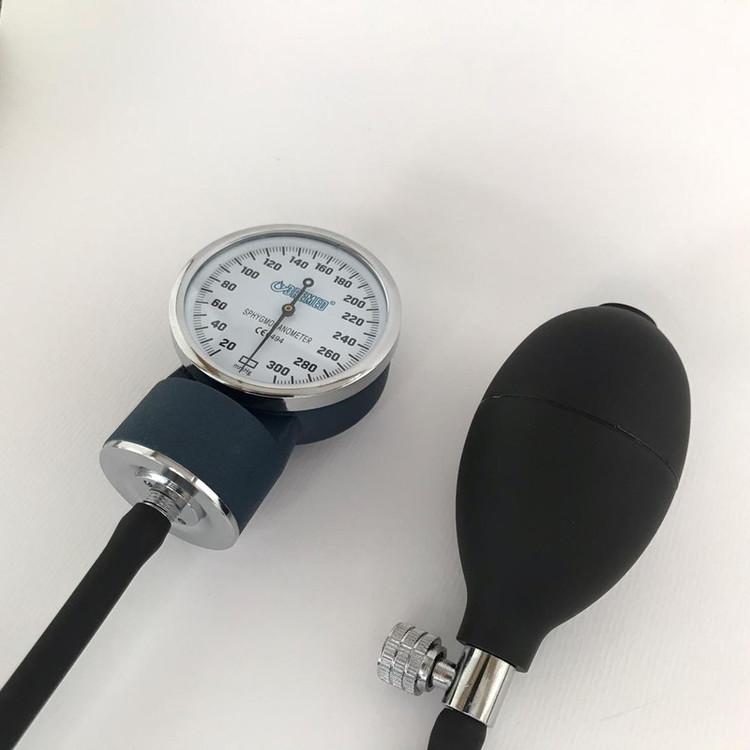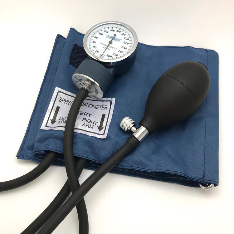 آموزش و نحوه استفاده از فشارسنج های عقربه ای بدین صورت می باشد:کاف(بازوبند) را بر روی بازوی سمت چپ ببندید.توجه کنید که لبه های پایین کاف باید بالای آرنج قرار گیرد.محل اتصال لوله ها به کاف باید به سمت پایین باشد.پمپ را در دست راست نگه دارید و دریچه را ببندید.کاف را با پمپ باد کنید.توصیه می گردد کاف را 20 الی 30 میلی متر جیوه بیشتر از فشار تخمینی باد کنید.(حدود 200 تا 220 میلی متر جیوه)