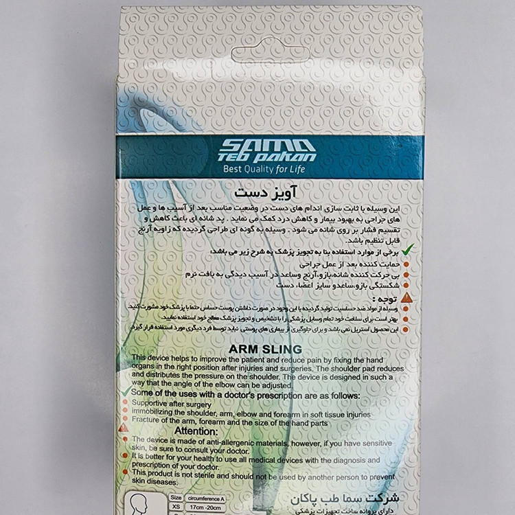 این وسیله با ثابت سازی اندام های دست در وضعیت مناسب بعد از آسیب ها و عمل های جراحی به بهبود بیمار و کاهش درد کمک می نماید . پد شانه ای باعث کاهش و تقسیم فشار بر روی شانه می شود . وسیله به گونه ای طراحی گردیده که زاویه آرنج قابل تنظیم باشد.