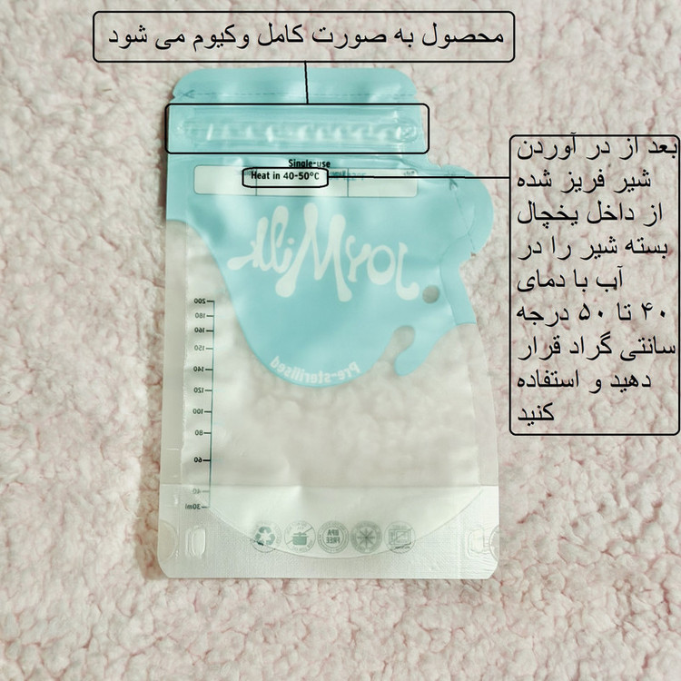 ساخته شده از مواد اولیه با گرید خوراکی-بهداشتی و ایمن و از پیش استریل شده-زیپ دوبل و ضد نشتی-ایمن در فریزر برای نگه داری بلند مدت(تا 3 ماه در فریزر)-گرم کردن آسان کیسه با قرار دادن در آب 40 تا 50 درجه سانتی گراد-قرار گیری به شکل ایستاده