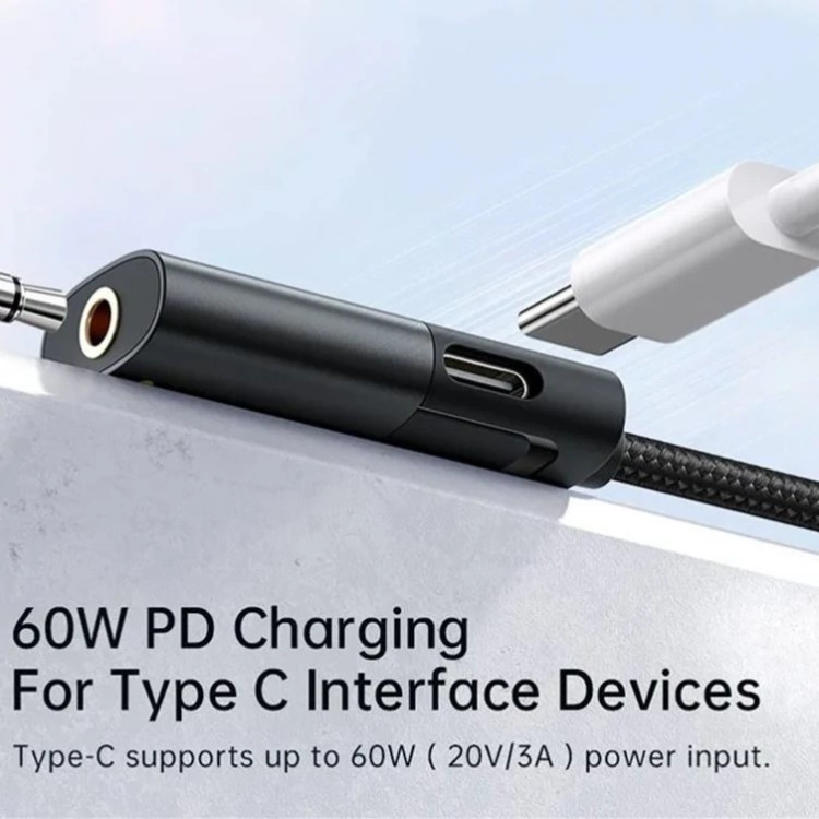این مبدل دارای دو خروجی است: یک پورت USB‑C برای شارژ تا 60 وات (20V/3A) و یک جک 3.5 میلیمتری برای هدفون یا اسپیکر. بنابراین بدون جداسازی کابلها، میتوانید هم گوشی یا تبلتتان را شارژ کنید و هم موسیقی گوش دهید یا تماس تلفنی برقرار کنید