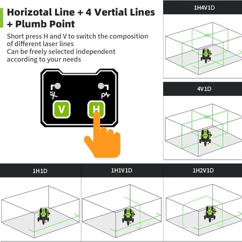 【ابزار لیزر چند خطی کارآمد】: سطح لیزر سبز رنگ Huepar L141G یک خط افقی، چهار خط عمودی و یک نقطه شاقول پایین را برای تراز کردن، تراز کردن برنامههای شاقول و مربع طراحی میکند. می توانید برای تغییر خطوط لیزر، دکمه های H یا V را به طور خلاصه فشار دهید، خطوط عمودی با زاویه 90 درجه در سقف از یکدیگر عبور می کنند و نقطه رو به بالا را تشکیل می دهند. 4 خط عمودی که سقف، دیوارها و کف را می پوشانند به طور موثر فضا را جدا می کنند.