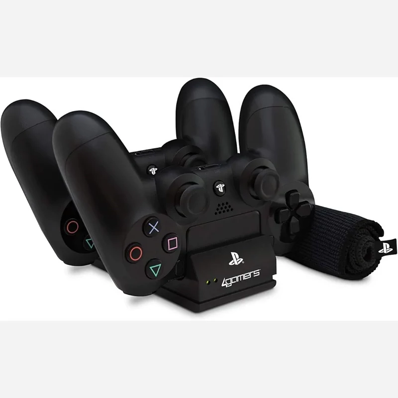 استند شارژ دوگانه کنترلر دوال شاک 4، دو عدد کنترلر پلی استیشن 4 را به صورت همزمان شارژ میکند تا همواره کنترلرهای شما شارژ داشته باشند. این استند دارای یک کابل AC سه شاخه برای اتصال مستقیم به منبع برق و یک دستمال تمیزکننده است و ظاهر زیبای آن در کنار کنسول، جذابیت بیشتری به سیستم بازی شما میدهد. این استند دارای دو نشانگر LED برای نمایش مقدار شارژ کنترلرها است و پس از پایان شارژ، به صورت خودکار جریان برق را قطع میکند تا کنترلرهای شما آسیب نبینند