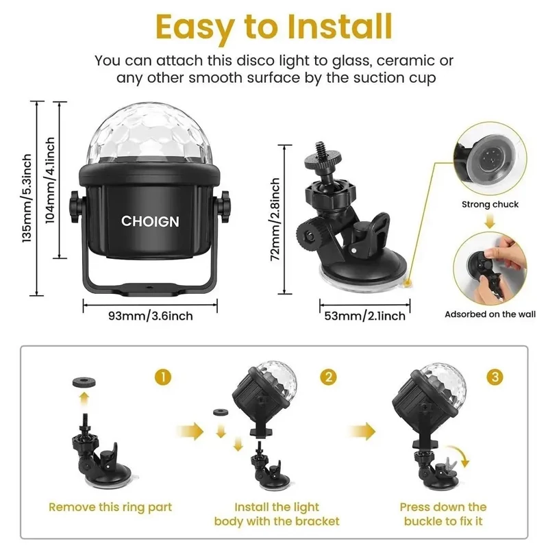 ما میتوانیم ویدئو ارائه دهیم، اما نصب آن واقعا آسان است. چراغ دیسکو دارای پایه و یک مکنده قوی است، می توانید آن را به سطوح صاف بچسبانید، نصب آن بر روی دیوار یا سقف و پنجره بسیار آسان است. شما یک اتاق دیسکو درخشان با آن خواهید داشت و کل اتاق نشیمن را روشن می کند