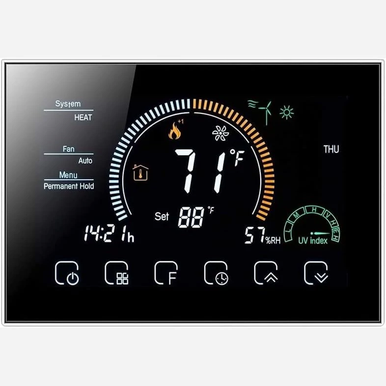 ترموستات شیک، بیسیم و با کاربری آسان، دارای ویژگیهای کنترل دما، صفحه نمایش بزرگ منفی سیاه است و با جعبههای هوشمند خانگی عرضهشده توسط Nassboards سازگار است.