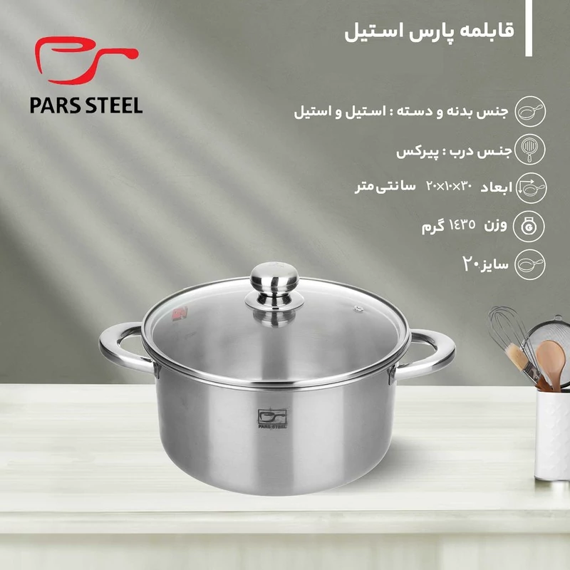 قابلمه پارس استیل مدل 200 سایز 20 با بدنهای از استیل ضدزنگ و ضدخش برای پختن غذایی سالم و لذتبخش بهترین گزینه است. ظروف استیل از قدیم ایام بسیار مورد استقابل و توجه بودهاند. دلیل اهمیت این ظروف دوام طولانی مدت و سازگاری با انواع مواد غذایی است. برای شستن ظروف استیل هیچ نگرانی به خود راه ندهید. فقط کافیست برای مدت کوتاهی مقداری آب گرم در آن ریخته تا کاملا تمیز شود. حتی استفاده از ماشین ظرفشویی برای شستن قابلمه پارس استیل بلامانع است. قابلمه پارس استیل دارای گنجایش 3.3 لیتر بوده و با ارتفاع 10 سانتیمتر برای دو تا چهار نفر کافی خواهد بود. کفی آلومینیوم سهلایه مانع از چسبندگی و سوختن غذا میشود و حرارت بهصورت یکنواخت به تمام ظرف منتقل میشود. محصولات پارس استیل با انواع اجاقگازها سازگار است و هیچ آسیبی به کف ظرف و گاز وارد نخواهد آمد.