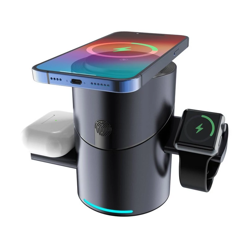 مشخصات فنی-توضیحات: ابعاد محصول: 76*76*110 میلیمتر - ورودی: DC 9 ولت/2 تا 3 آمپر، 5 ولت/3 آمپر - خروجی: 15 وات/10 وات/7.5 وات/5 وات/2.5 وات - خروجی برای هندزفری: 2.5 وات - خروجی برای ساعت: 2.5 وات - جنس محصول: ABS + شیشه حرارتدیده - دارای آهنربای فوقالعاده قوی داخلی N52 - قابلیت شارژ سریع بیسیم - قابلیت شناسایی خودکار
