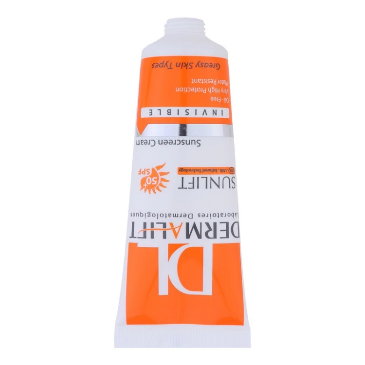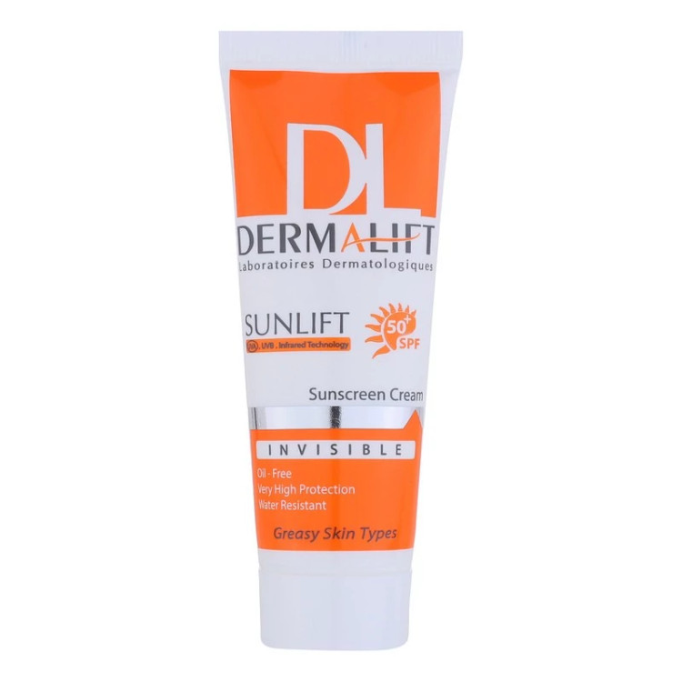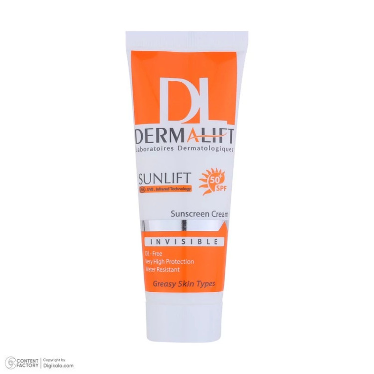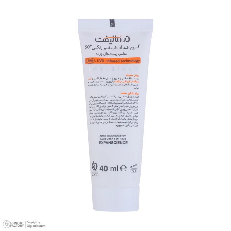 کرم ضدآفتاب بی‌رنگ درمالیفت مدل SPF50، مناسب پوست‌های چرب، حجم 40 میلی‌لیتر