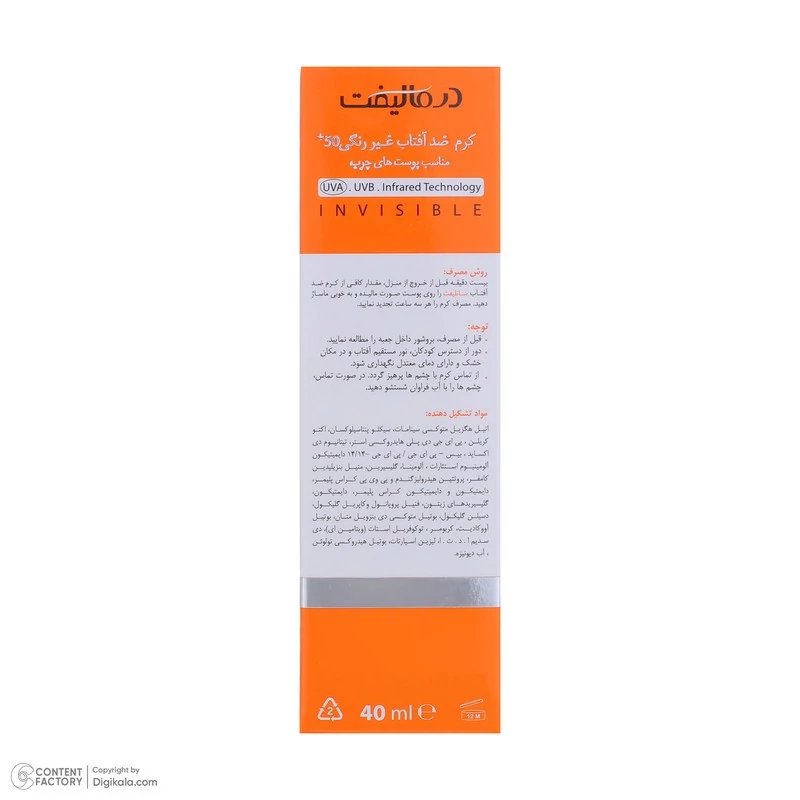 کرم ضدآفتاب بیرنگ درمالیفت مدل SPF50، مناسب پوستهای چرب، حجم 40 میلیلیتر
