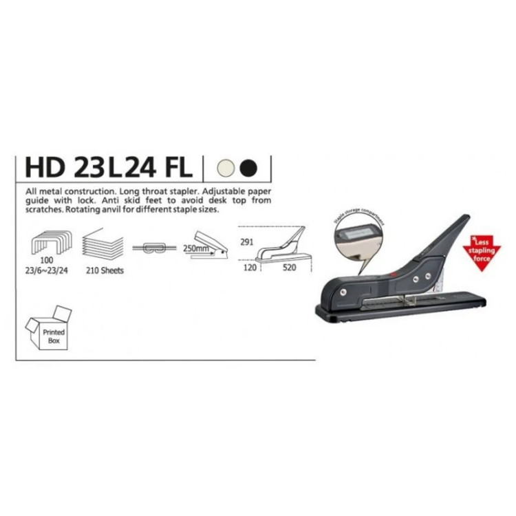 جنس دستگاه تماما فلزی بوده و از استحکام بالایی برخوردار است. دهانه دستگاه تا 250 میلیمتر باز شده و این امکان را به کاربر می دهد. تا به راحتی بتواند اسناد خود را تا سایز A3 , A3+ از وسط منگنه نماید.